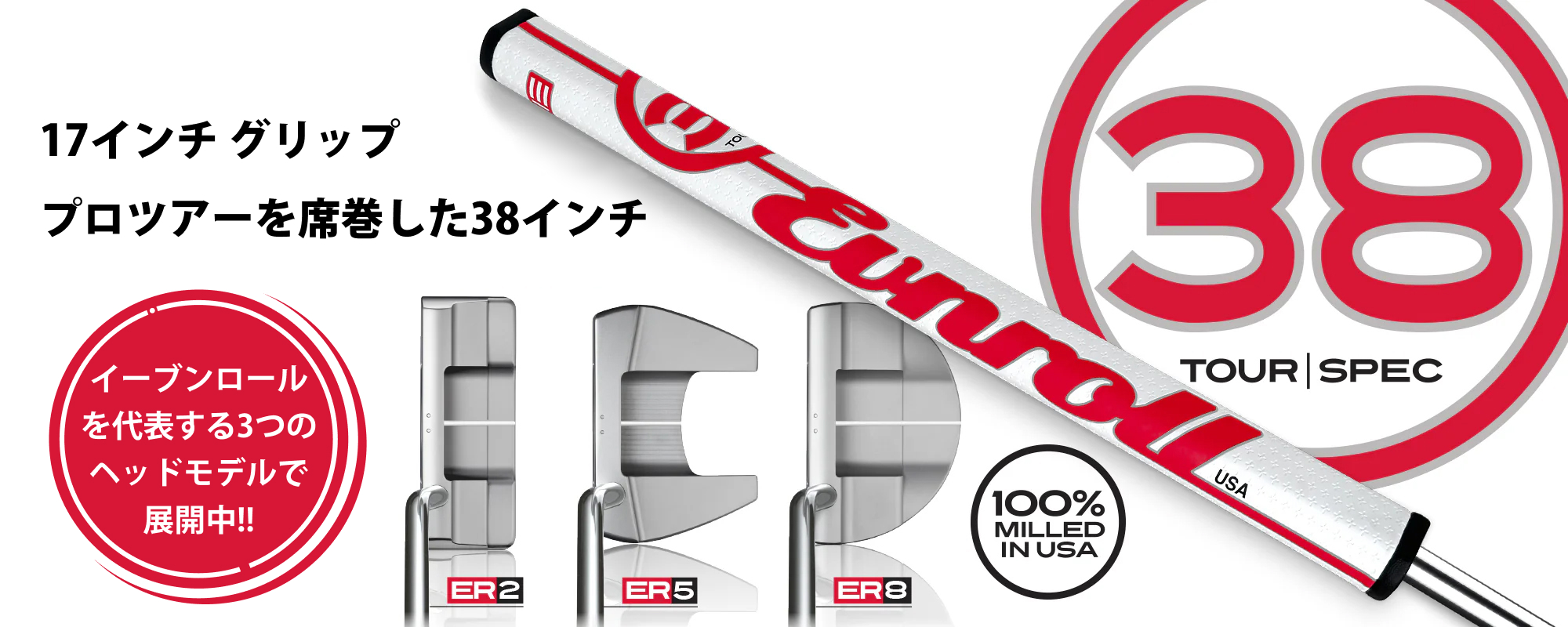 "38 TOUR SPEC" シリーズは、プロツアーを席巻した38インチのパターをイーブンロールを代表する人気のヘッドモデルで展開しています。Stability(安定性)とRoll(転がり)を追求したツアースペックパターです。